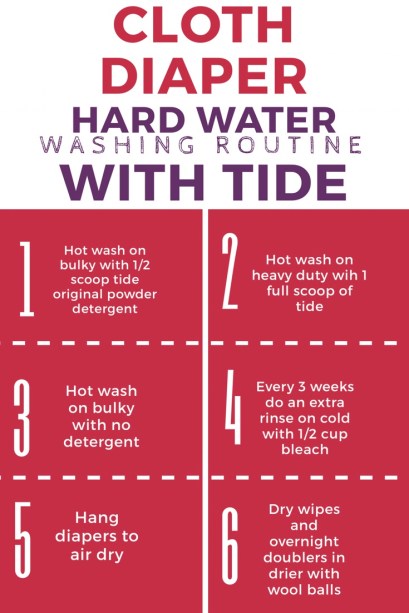 Every three-ish weeks, I add an extra cold rinse cycle to the end of the routine and add 1/2 cup of bleach to the cycle. BumGenius suggests this on the packaging of their Freetime diaper. It helps keep bacteria and yeast away. I have done this regularly since I started using Tide with cloth and haven’t ever had ammonia, yeast, or any sort of smelly diapers. If my kids ever do have a diaper rash, I will add bleach to every diaper routine until the rash is gone, but this might be overkill. I just want to make sure that the rash isn’t from bacteria and that the diapers are extra clean.