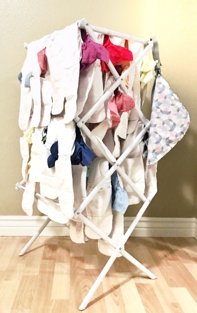 I then hang the diapers to dry overnight on a drying rack and throw the wipes and any nighttime doublers into the dryer for a normal cycle WITHOUT a dryer sheet, I do use wool dryer balls. To be honest, I don’t really see a difference with or without the dryer balls, but I have them so I use them.